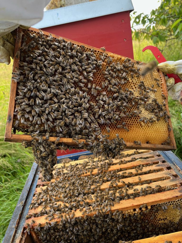 Fleißigen Bienen und Jan Höbel (unserem lokalen Imker des Vertrauens) sei Dank, konnte bereits in diesem Jahr der erste Schulhonig hergestellt werden. Die Heimat der beiden Bienenvölker, die hierfür maßgeblich verantwortlich waren, stehen auf der schuleigenen Streuobstwiese, die erst im letzten Jahr, in Kooperation mit dem Naturpark Saar-Hunsrück gepflanzt wurde. Hier fanden die fleißigen Insekten scheinbar bereits so viel Futter, dass es direkt für eine veritable Ernte ausgereicht hat.
